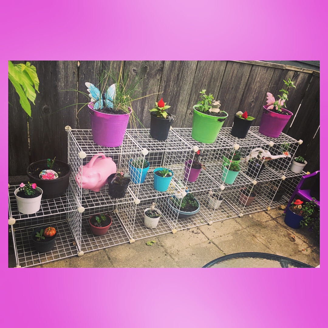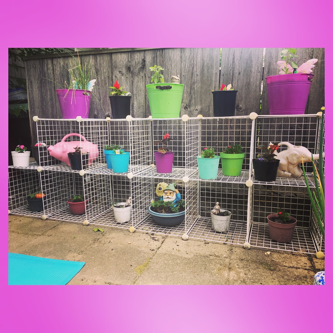 I have had these modular wire cubes from Target for a while. I brought them out of doors to use on the porch garden at my old apartment in Roslindale, Boston. I kept them for the same purpose for the patio garden at my new apartment in Federal Hill, Providence. Wire cubes are a great way to build vertical space if you’re container gardening, because the all-important sunshine can come through at all angles. The only trick with these ones is the height of them. I have to keep the tall-growing plants on the top shelves. I put the smaller growing plants in the inner cubes.