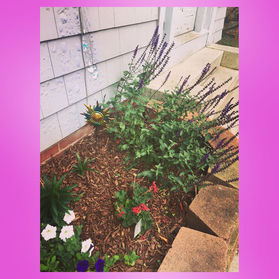 The front of the house has a little bit of garden space, as well. I found a ton of clearance plants at Lowes and planted those for the “annual” part of the garden. I planted the Russian sage last year and they’re doing well. I’d planted a phlox plant last year but it didn’t come back, so I planted dianthus for a perennial this year. Hope it makes it back. It’s very pretty. I added tchotchoke from the Dollar Tree and Christmas Tree Shops to fil in space until the plants bloomed.
