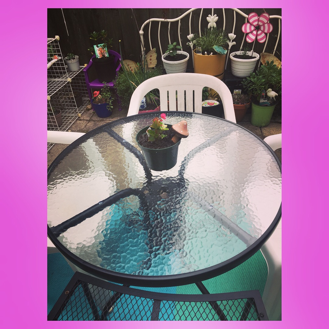 A Tour of the Patio Container Garden with Herbs, Flowers, and Succulents Featuring Faerie Garden Accents and Upcycled Furniture