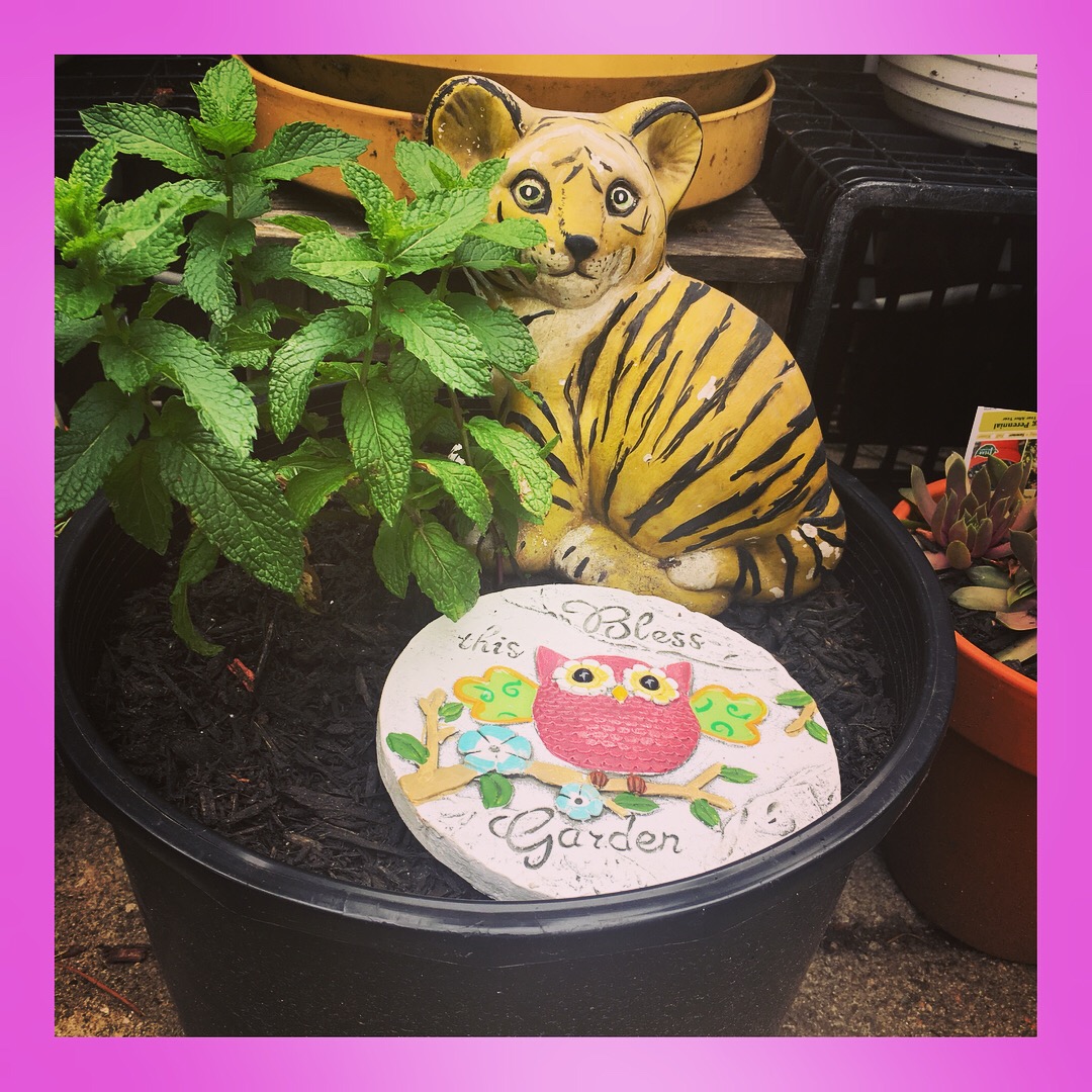 Mojito Mint from Muddy River Herbals. It’s THRIVING! The ceramic tiger was painted by my father.